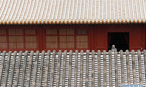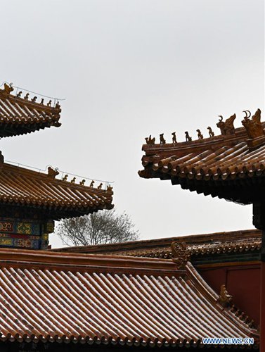 Snow-covered buildings are seen at the Palace Museum in Beijing, capital of China, Feb. 14, 2019. All tickets to the museum, which allows 80,000 visitors per day, were sold out on Thursday. (Xinhua/Jin Liangkuai)