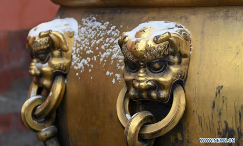 The photo shows a snow-covered bronze water vat at the Palace Museum in Beijing, capital of China, Feb. 14, 2019. All tickets to the museum, which allows 80,000 visitors per day, were sold out on Thursday. (Xinhua/Jin Liangkuai)