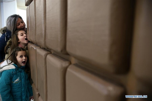 Visitors pose biting a huge panel of chocolate during the Chocolate Festival in Athens, Greece, Feb. 16, 2019. The four-day festival, held from February 14 to 17, involved tasting sessions, workshops and children activities led by experts dedicated to the art of chocolate. (Xinhua/Marios Lolos)