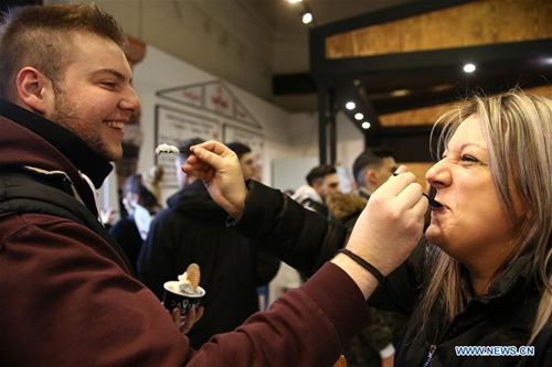 Visitors taste chocolate during the Chocolate Festival in Athens, Greece, Feb. 16, 2019. The four-day festival, held from February 14 to 17, involved tasting sessions, workshops and children activities led by experts dedicated to the art of chocolate. (Xinhua/Marios Lolos)