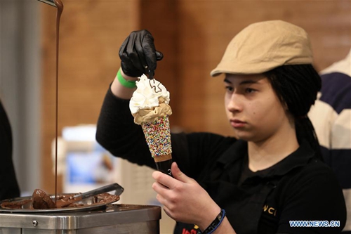 A worker makes an ice cream during the Chocolate Festival in Athens, Greece, Feb. 16, 2019. The four-day festival, held from February 14 to 17, involved tasting sessions, workshops and children activities led by experts dedicated to the art of chocolate. (Xinhua/Marios Lolos)