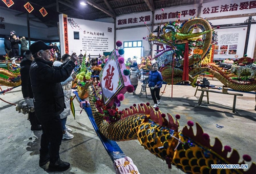 Villagers visit the wooden-bench dragon exhibited in the rural cultural hall at Yaokou Village of Huyuan Township in Hangzhou, capital city of east China's Zhejiang Province, on Feb. 17, 2019. Yaokou Village is famous for its wooden-bench dragon dance, which is originated from the Qing Dynasty (1644-1911). The wooden-bench dragon is 130 meters long with 58 wooden benches linked together, on which various lantern decorations are installed. People dressed in traditional costumes would dance the wooden-bench dragon at major festival events to pray for good luck in a new year. (Xinhua/Xu Yu)