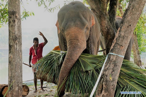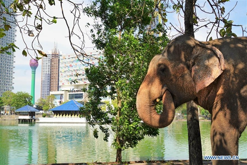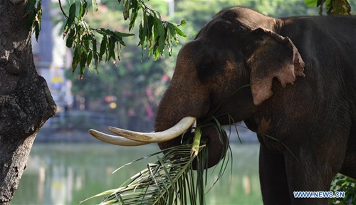 An elephant eats along the Beira Lake in Colombo, Sri Lanka, on Feb. 18, 2019. Dozens of elephants gathered here to take part in the annual Buddhist Navam procession at the Gangaramaya Temple, scheduled for Feb. 18-19, with thousands of traditional drummers, dancers, and monks. (Xinhua/A.HAPUARACHCHI)