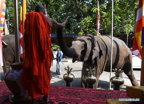 A monk feeds an elephant at the Gangaramaya Temple in Colombo, Sri Lanka, on Feb. 18, 2019. Dozens of elephants gathered here to take part in the annual Buddhist Navam procession at the Gangaramaya Temple, scheduled for Feb. 18-19, with thousands of traditional drummers, dancers, and monks. (Xinhua/A.HAPUARACHCHI)