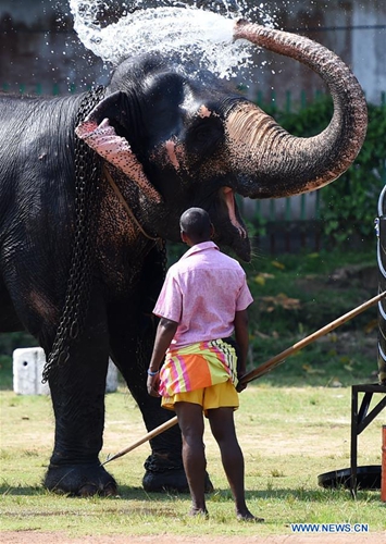 A worker sprays water to an elephant along the Beira Lake in Colombo, Sri Lanka, on Feb. 17, 2019. Dozens of elephants gathered here to take part in the annual Buddhist Navam procession at the Gangaramaya Temple, scheduled for Feb. 18-19, with thousands of traditional drummers, dancers, and monks. (Xinhua/Tang Lu)