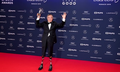Xia Boyu, a double amputee who climbed Mount Everest, winner of the Laureus Sporting Moment of the Year 2019, poses with his award during the 2019 Laureus World Sports Awards on Monday in Monaco. Photo: VCG