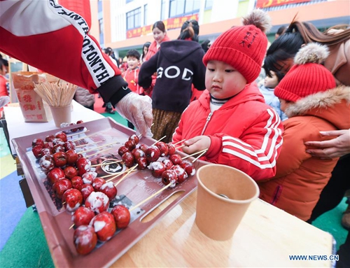 A child picks up a stick of sugar-coated haws during a traditional cultural activity to start the new semester at a local kindergarten in Changxing County of east China's Zhejiang Province, Feb. 20, 2019. (Xinhua/Xu Yu)