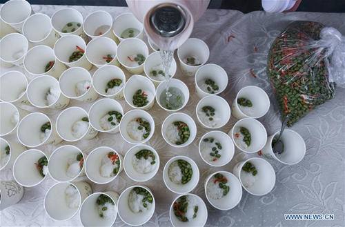 A teacher makes green soybean tea for children during a traditional cultural activity to start the new semester at a local kindergarten in Changxing County of east China's Zhejiang Province, Feb. 20, 2019. (Xinhua/Xu Yu)