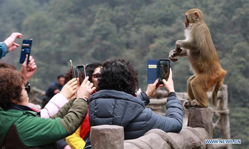 A macaque faces tourists' cellphones at Wulingyuan National Park in Zhangjiajie, central China's Hunan Province, on Feb. 24, 2019. The early spring brought warm weather to the national park and lively macaques drew a lot of tourists' attention. (Xinhua/Wu Yongbing)
