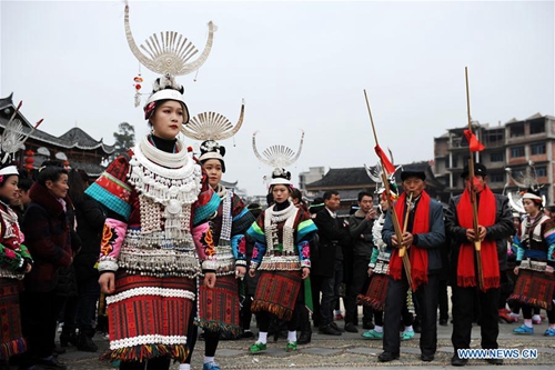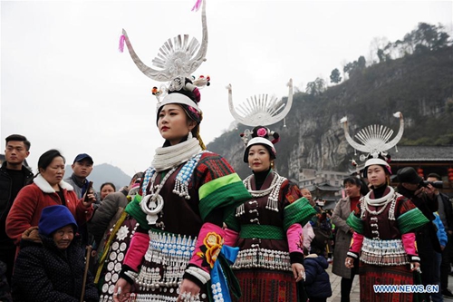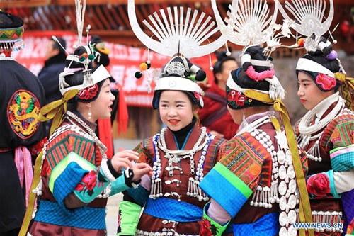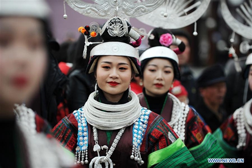 Villagers in traditional costumes are seen during the Gannangxiang celebration in Zhouxi Town, Kaili City of southwest China's Guizhou Province, Feb. 24, 2019. The ethnic Miao girls donning traditional embroidered attire and silver ornaments sing and dance to the sound of the lusheng, a reed-pipe wind instrument, to pray for a good harvest. Ethnic Miao people get together at Gannangxiang to rejoice in the annual Gannangxiang celebration, one of the largest-scale and most primitive Miao lusheng celebrations in Guizhou Province. (Xinhua/Wu Jibin)