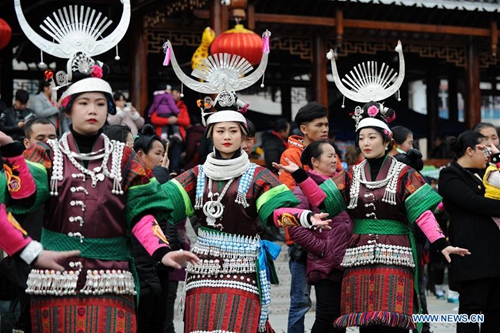 People in traditional costumes perform the lusheng dance in Zhouxi Town, Kaili City of southwest China's Guizhou Province, Feb. 24, 2019. The ethnic Miao girls donning traditional embroidered attire and silver ornaments sing and dance to the sound of the lusheng, a reed-pipe wind instrument, to pray for a good harvest. Ethnic Miao people get together at Gannangxiang to rejoice in the annual Gannangxiang celebration, one of the largest-scale and most primitive Miao lusheng celebrations in Guizhou Province. (Xinhua/Yang Wenbin)