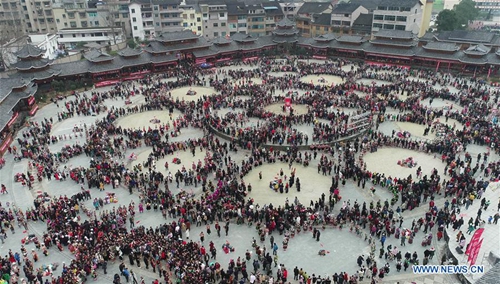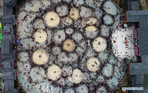 Aerial photo taken on Feb. 24, 2019 shows people of the Miao ethnic group performing the lusheng dance in Zhouxi Town, Kaili City of southwest China's Guizhou Province. The ethnic Miao girls donning traditional embroidered attire and silver ornaments sing and dance to the sound of the lusheng, a reed-pipe wind instrument, to pray for a good harvest. Ethnic Miao people get together at Gannangxiang to rejoice in the annual Gannangxiang celebration, one of the largest-scale and most primitive Miao lusheng celebrations in Guizhou Province. (Xinhua/Yang Wenbin)