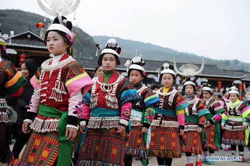 Kids in traditional costumes perform the lusheng dance in Zhouxi Town, Kaili City of southwest China's Guizhou Province, Feb. 24, 2019. The ethnic Miao girls donning traditional embroidered attire and silver ornaments sing and dance to the sound of the lusheng, a reed-pipe wind instrument, to pray for a good harvest. Ethnic Miao people get together at Gannangxiang to rejoice in the annual Gannangxiang celebration, one of the largest-scale and most primitive Miao lusheng celebrations in Guizhou Province. (Xinhua/Yang Wenbin)