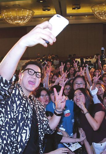 South Korean singer The One takes a selfie with fans at press conference for his first Chinese album Because of You in Beijing on September 4, 2015. Photo: VCG