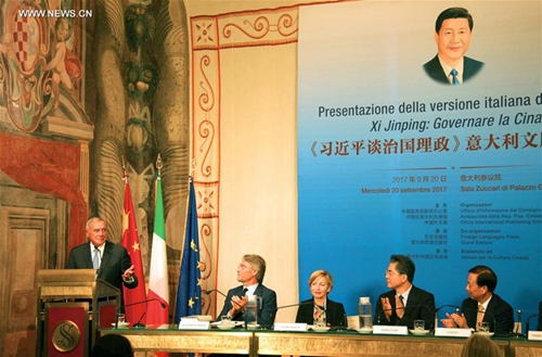 Italian Senate Speaker Pietro Grasso (1st L) addresses the launch ceremony of the Italian edition of "Xi Jinping: The Governance of China" in Rome, Italy, Sept. 20, 2017. (Xinhua/Li Jie)