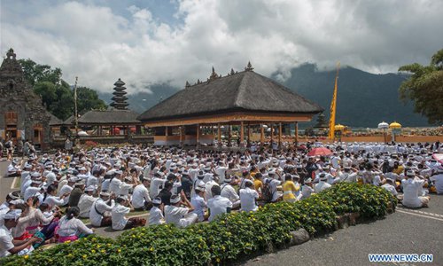 Picture taken on March 4, 2019 shows Indonesian Hindu devotees participating in Melasti ceremony in Bali, Indonesia. Hindus hold the Melasti ceremony to clean their souls before celebrating the Nyepi Day, the Balinese Day of Silence. (Xinhua/Fauzy Chaniago)