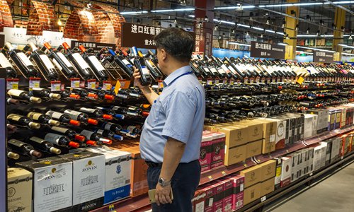 A consumer buys wine imported from Italy in a supermarket in Shanghai in June 2018. Photo: VCG