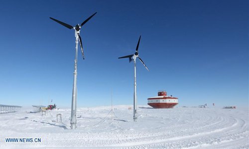 Photo taken on Feb. 2, 2019 shows solar panels and wind turbines set up to power the main building (R) of China's Taishan Station with clean energy in Antarctica. China's icebreaker Xuelong, also known as the Snow Dragon, is on its way back home from its 35th Antarctic research mission aboard. The completion of the second stage of Taishan station is one the most important achievements by researchers, who have established new buildings and systems of power generation, snow melting and sewage treatment under snow. (Xinhua)