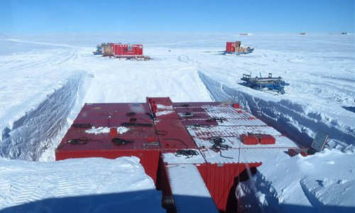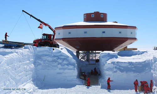 Members of China's Taishan scientific expedition team establish new buildings under snow at Taishan Station in Antarctica, Jan. 1, 2019. China's icebreaker Xuelong, also known as the Snow Dragon, is on its way back home from its 35th Antarctic research mission aboard. The completion of the second stage of Taishan station is one the most important achievements by researchers, who have established new buildings and systems of power generation, snow melting and sewage treatment under snow. (Xinhua)