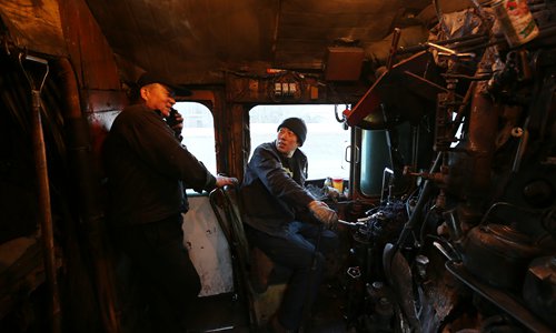 Li checks the signal by looking out of the window of the steam locomotive. Photo: Cui Meng/GT
