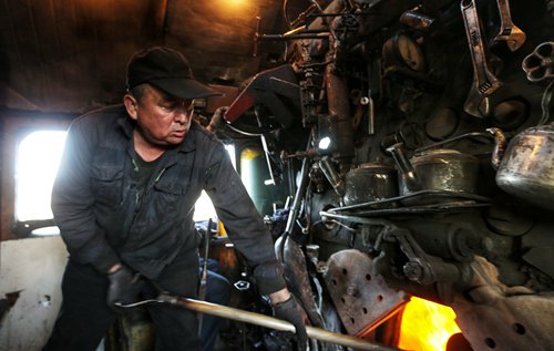 Memeti does the stoker's job, since young people aren't willing to work on steam locomotive. Drivers have to take on different duties during work. Photo: Cui Meng/GT
