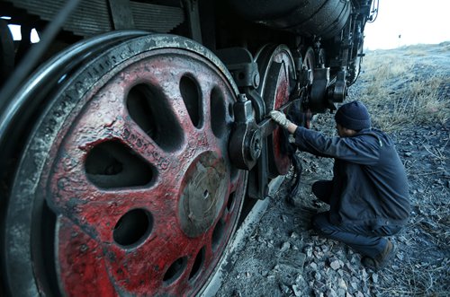 Memeti applies lubricating oil to parts of the locomotive. He has shown up for work every day for the last 35 years. Photo: Cui Meng/GT