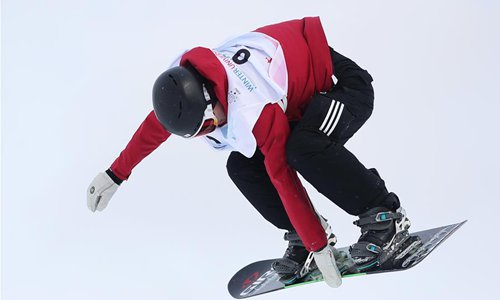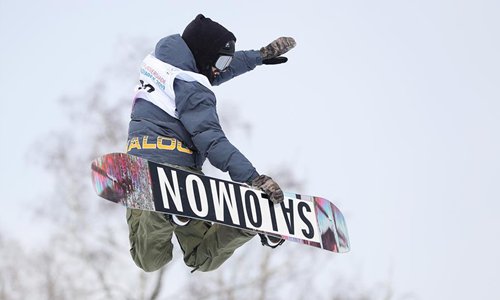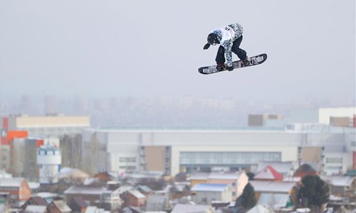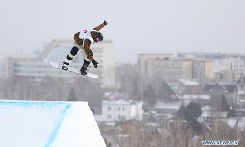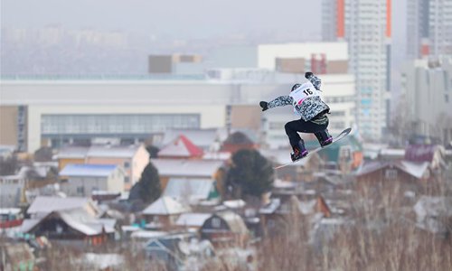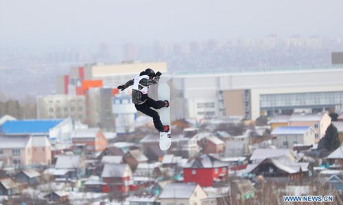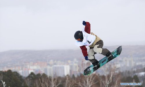 Feng Changjun of China competes during the Snowboard Men's Slopestyle qualification match at the 29th Winter Universiade in Krasnoyarsk, Russia, March 10, 2019. (Photo: Xinhua)
