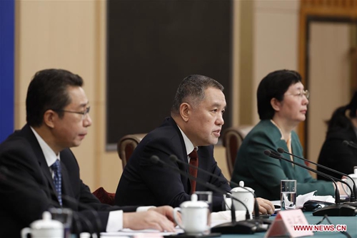 Zhang Mao (C), chief of the State Administration for Market Regulation, Jiao Hong (2nd R), head of the National Medical Products Administration, and Shen Changyu (2nd L), head of the State Intellectual Property Office, attend a press conference on "strengthening market regulation and maintaining market order" for the second session of the 13th National People's Congress (NPC) in Beijing, capital of China, March 11, 2019.(Photo:Xinhua)