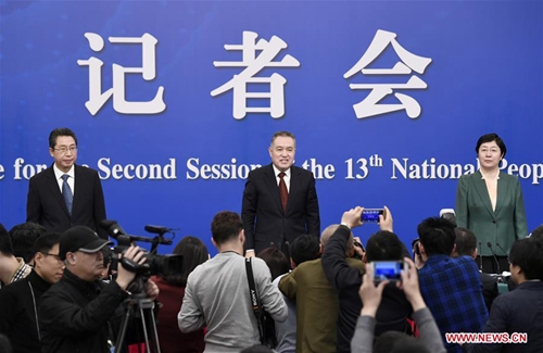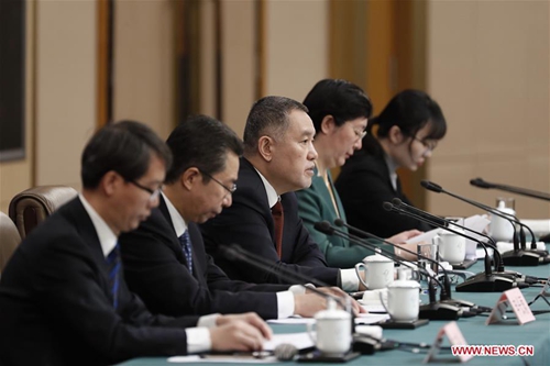 Zhang Mao (C), chief of the State Administration for Market Regulation, attends a press conference on "strengthening market regulation and maintaining market order" for the second session of the 13th National People's Congress (NPC) in Beijing, capital of China, March 11, 2019. (Photo:Xinhua)