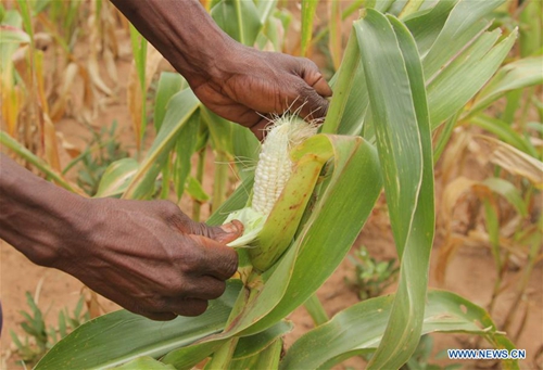 A farmer checks the growth of maize in drought-hit fields in Macheke, Mashonaland East Province, Zimbabwe, March 10, 2019. A disaster is looming in Zimbabwe following a severe drought that has left most of the planted maize crop for the current season either moisture-stressed or being declared a write-off. The government is still to come up with its own crop assessment for the 2018/19 season, but projections from farmers put the yield as about half the 2017/18 yield. (Photo:Xinhua)