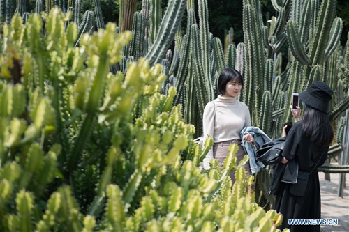 Visitors enjoy themselves at the succulent plants sector at Xiamen Botanical Garden in Xiamen, southeast China's Fujian Province, on March 16, 2019. (Photo:Xinhua)