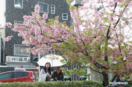 People view blooming cherry blossoms near the Tokyo Skytree in Tokyo, Japan, March 16, 2019. (Photo:Xinhua)