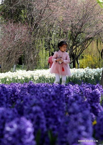 A child views blooming flowers at a park in east China's Shanghai, March 23, 2019. (Photo:Xinhua)