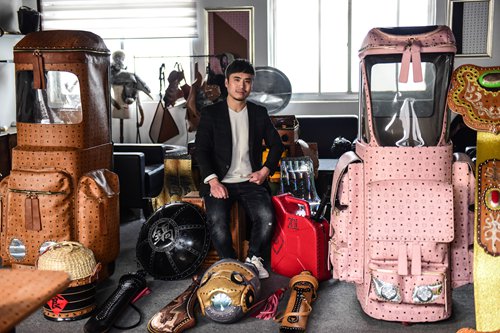 Zhang's eldest son shows off one of his father's bags shaped like a wok. Photo: IC