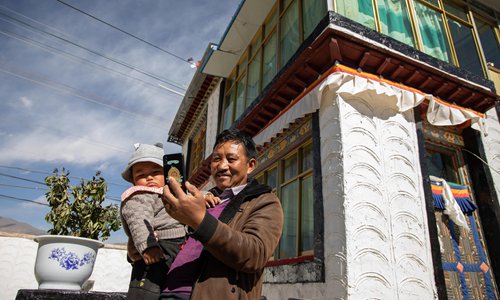 A villager living in a suburb of Lhasa, capital city of Southwest China's Tibet Autonomous Region, smiles while having a video chat with his daughter on March 8. The internet is rapidly entering the lives of Tibetans. By 2018, mobile broadband (including 3G and 4G) users in Tibet reached 2.76 million households. Photo: Li Hao/GT