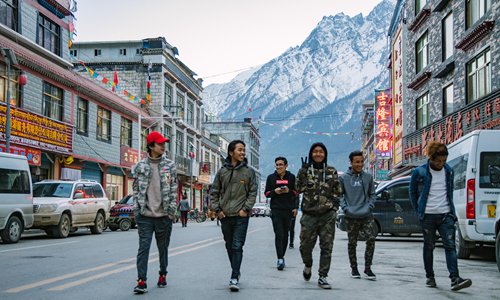Young truck drivers from Nepal take a stroll in Gyirong, a town of China's Tibetan Autonomous Region bordering with Nepal on March 17. The rapid development in Tibet has attracted more people from Nepal to the Gyirong town, where they can earn more compared to their hometowns. Photo: Li Hao/GT