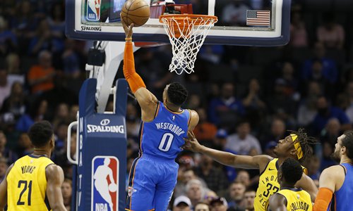 Oklahoma City Thunder guard Russell Westbrook goes to the basket against the Indiana Pacers on Wednesday in Oklahoma City. Photo: IC