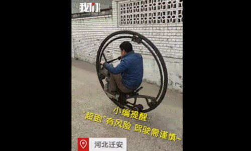 A video of a young man from a village in North China riding his motorcycle with a single-wheel that is actually a hoop around the entire bike has become a hit on social media, with netizens offering advice and good humor critiques of his invention.
