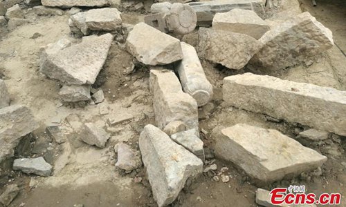 The remains of a stone bridge are seen at the Huangsipu ruins in Yangshe Town, Zhangjiagang City, Jiangsu Province, April 2, 2019. Archaeologists have agreed the ruins are where Jianzhen, a Buddhist monk in the Tang Dynasty (618-907), set off to visit Japan in his sixth, and also final, attempt to do so. Nanjing Museum has organized six excavations at the site since 2008, discovering remains of a bridge, a house and a well dating back to the Tang and Song dynasties. Huangsipu is considered to have been an important port on the lower reaches of the Yangtze River. (Photo: China News Service)