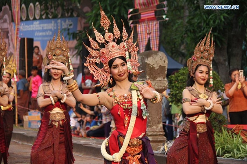 Performers dance on the parade Kheun Khao Phanom Rung, or "up into the Phanom Rung mountain", in Buriram province, northeastern Thailand, on April 6, 2019. The over three-hour parade is a ritual celebrated by locals for years in order to promote traditional culture and attract tourists. (Photo:Xinhua)