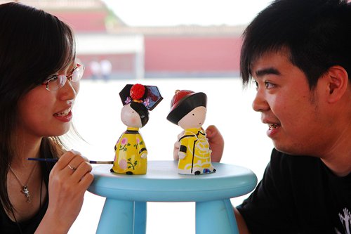 Two tourists paint a pair of emperor and empress dolls. Photo: VCG