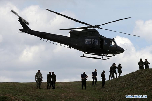 A military helicopter of the Philippine Air Force participates in a live fire exercise as part of the Philipines-U.S. Balikatan 2019 in Tarlac Province, the Philippines, April 10, 2019. The Philippines and the United States began on April 1 their biggest annual joint military exercise known as Balikatan, or Shoulder-to-Shoulder. Exercise spokesman for the Philippines Lt. Cmdr. Liez Vidallon has said there are around 7,500 participating troops, consisting of some 4,000 Philippine troops and 3,500 U.S. troops, in this year's drills. (Photo:Xinhua)