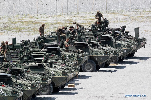 U.S. Marines are seen after a live fire exercise as part of the Philipines-U.S. Balikatan 2019 in Tarlac Province, the Philippines, April 10, 2019. The Philippines and the United States began on April 1 their biggest annual joint military exercise known as Balikatan, or Shoulder-to-Shoulder. Exercise spokesman for the Philippines Lt. Cmdr. Liez Vidallon has said there are around 7,500 participating troops, consisting of some 4,000 Philippine troops and 3,500 U.S. troops, in this year's drills. (Photo:Xinhua)