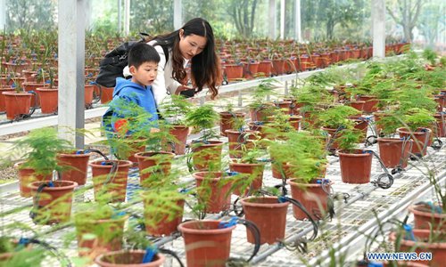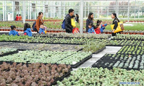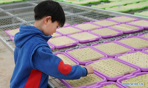 A child views seedlings at a greenhouse of a modern agricultural science and technology demonstration park in Guanqiao Village of Jiayu County, central China's Hubei Province, April 11, 2019. (Photo: Xinhua)