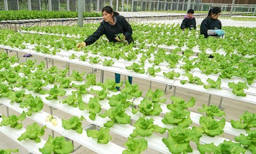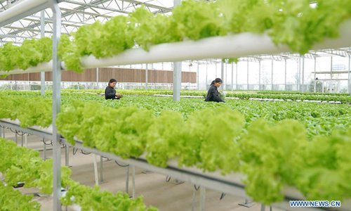 Farmers work at a greenhouse of a modern agricultural science and technology demonstration park in Guanqiao Village of Jiayu County, central China's Hubei Province, April 10, 2019. (Photo: Xinhua)