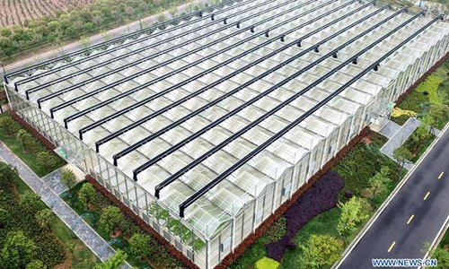 Aerial photo taken on April 10, 2019 shows a greenhouse at a modern agricultural science and technology demonstration park in Guanqiao Village of Jiayu County, central China's Hubei Province. (Photo: Xinhua)