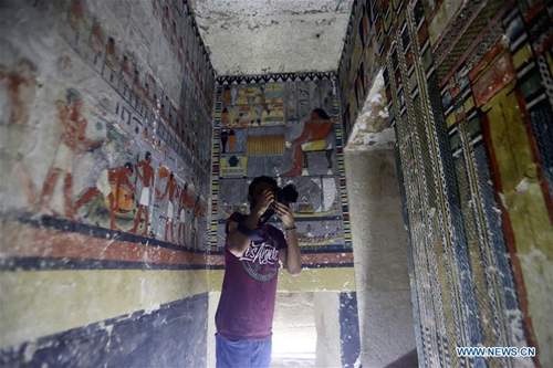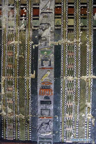 Photo taken on April 13, 2019 shows the paintings in a tomb in Saqqara, Egypt. Egyptian Ministry of Antiquities opened on Saturday a tomb of a Fifth Dynasty dignitary which was discovered recently at Saqqara Necropolis near the Giza pyramids. Minister of Antiquities Khaled al-Anany, along with 52 ambassadors and cultural attaches of foreign, Arab and African countries, toured Saqqara Necropolis to inspect the tomb of Khuwy, who lived at the end of the Fifth Dynasty of the Old Kingdom. The Old Kingdom of Egypt is the period spanning 2686 BC to 2181 BC, which is also known as the Age of the Pyramids. (Photo:Xinhua)