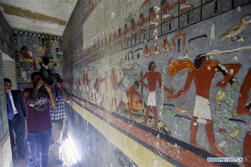 People visit a tomb in Saqqara, Egypt on April 13, 2019. Egyptian Ministry of Antiquities opened on Saturday a tomb of a Fifth Dynasty dignitary which was discovered recently at Saqqara Necropolis near the Giza pyramids. Minister of Antiquities Khaled al-Anany, along with 52 ambassadors and cultural attaches of foreign, Arab and African countries, toured Saqqara Necropolis to inspect the tomb of Khuwy, who lived at the end of the Fifth Dynasty of the Old Kingdom. The Old Kingdom of Egypt is the period spanning 2686 BC to 2181 BC, which is also known as the Age of the Pyramids. (Photo:Xinhua)
