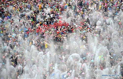 People celebrate the water-sprinkling festival at the Wild Elephant Valley scenic spot in Dai Autonomous Prefecture of Xishuangbanna, southwest China's Yunnan Province, April 14, 2019. People sprinkle water to each other to pray for good fortune during the traditional water-sprinkling festival, which is also the New Year festival of the Dai ethnic group. (Photo:Xinhua)