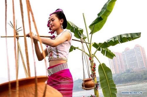 A girl of Dai ethnic group collects water to celebrate the water-sprinkling festival beside the Lancangjiang river in southwest China's Yunnan Province, April 15, 2019. People sprinkle water to each other to pray for good fortune during the traditional water-sprinkling festival, which is also the New Year festival of the Dai ethnic group. (Photo:Xinhua)